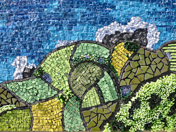 Die sogenannte Textur entsteht durch unterschiedliche Höhen und Setzweisen des verschiedenartigen Materials in ein Mörtelbett mit der sogenannten aufsteigenden Fuge, wodurch am Ende nicht verfugt werden muss. Im Spiel mit Kontrasten des Materials, klassischen und freien Legeweisen, Leerräumen und detaillierten Flächen erzielt Ihr dadurch sehr spannende Bilder. Diese Arbeitsweise lockt aus jedem sein kreatives Potential hervor. Werft doch mal einen Blick auf meine Galerieseite, da könnt Ihr viele Beispiele dieser Technik sehen.